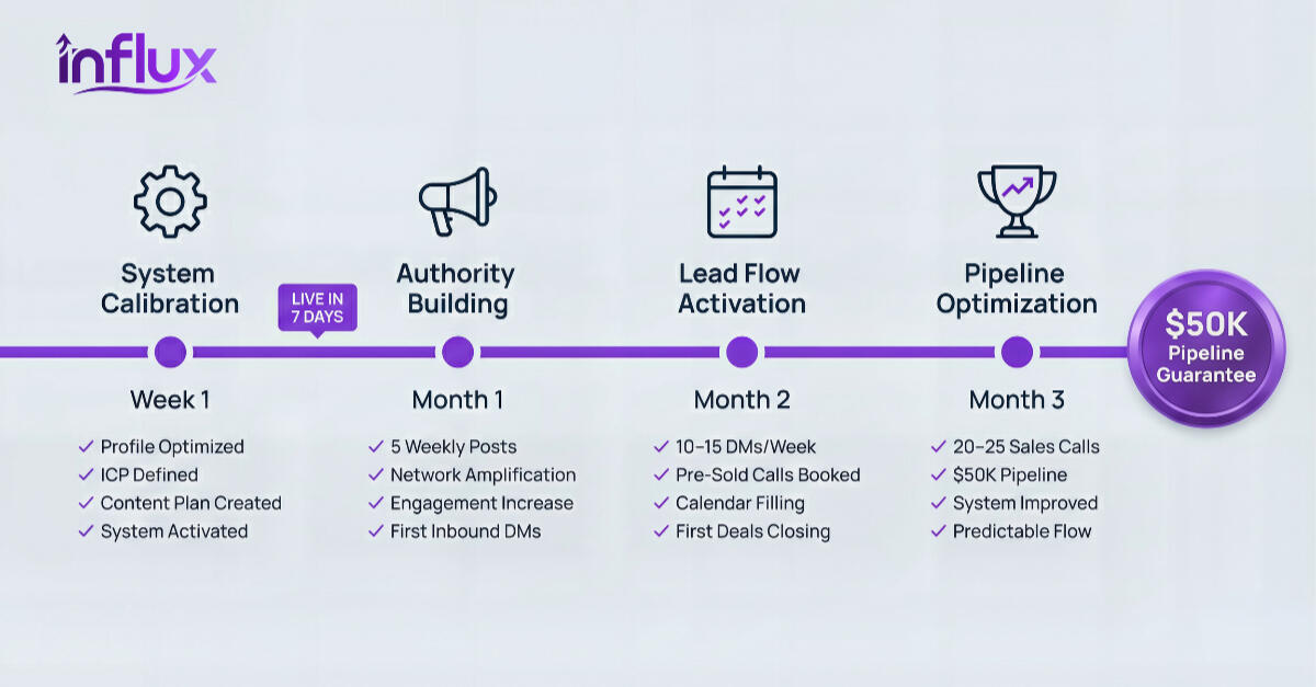 The difference is systems vs. tasks and guarantees vs. promises. A VA is a task-doer. You still have to provide the strategy, the content, and the process. You are the manager. Most agencies will sell you a list of deliverables (e.g., "10 posts per month") but make no promise about the outcome. Influx provides a complete, end-to-end system for client acquisition. We provide the strategy, the content, the amplification, and the process. And most importantly, we guarantee the result ($50K pipeline) in writing.